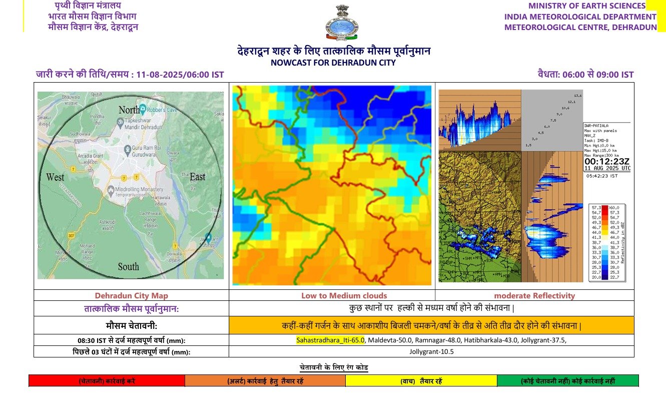 अगले 3 घंटों में ( रेड अलर्ट दिनांक 11.08.2025 8:44 AM बजे से 11.08.2025 11:44 AM बजे तक ) जनपद – अल्मोडा, देहरादून, हरिद्वार, नैनीताल, पौडी गढ़वाल, उधम सिंह नगर अलग-अलग स्थानों पर यथा – लैंडस्डाउन, रूड़की, रायवाला, कोटद्वार, रामनगर, काशीपुर, रानीखेत, लालकुआं तथा इनके आस-पास के छेत्रो में कई स्थानों पर मध्यम से भारी वर्षा तथा कुछ स्थानों पर बहुत भारी वर्षा/गरज के साथ छींटे पड़ने/तीव्र से बहुत तीव्र वर्षा होने की संभावना है।