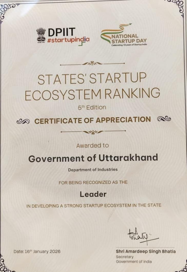 वाणिज्य एवं उद्योग मंत्रालय ने प्रदान किया Certificate of Appreciation भारत सरकार के वाणिज्य एवं उद्योग मंत्रालय के अंतर्गत उद्योग संवर्धन एवं आंतरिक व्यापार विभाग (DPIIT) द्वारा जारी States’ Startup Ecosystem Ranking (5वां संस्करण) में उत्तराखण्ड को मजबूत स्टार्टअप इकोसिस्टम विकसित करने में ‘लीडर’ के रूप में मान्यता प्रदान की गई है इस उपलब्धि के लिए राष्ट्रीय स्टार्टअप दिवस के अवसर पर उत्तराखण्ड सरकार के उद्योग विभाग को Certificate of Appreciation प्रदान किया गया